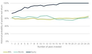 The long run probabilities are shown in Figure 1. As the investment horizon extends out, up to 25 years, the probability of equities providing a real return increases. The higher returns on the investment eventually overcome any initial shortfall. Bond and bill investments show little improvement with a longer investment horizon2. At horizons of 20 years, the probability of delivering a positive real return from nominal bonds was only 60%. Historically, all investment horizons of 16 years (and longer) have provided a positive real return for Australian equities. While history does not provide a guarantee, the increase shown in Figure 1 should provide confidence that a long-term investment in equities will provide real capital growth. This analysis can be extended to diversified products such as a 70/30 growth fund (70% equities and 30% bonds) and a 50/50 balanced fund (50% equities and 50% bonds). These both show trend improvements over time, benefiting from the exposure to growth assets, but over longer periods. The 70/30 fund needed 20 years and the 50/50 fund 25 years historically to ensure the positive real return.