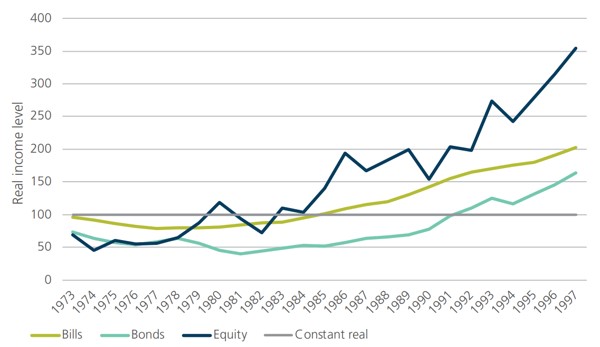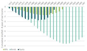We can examine this difference by considering the outcome for someone who started to draw an income at the start of 1973. This was one of the worst years in the historical comparison where the inflation spike meant that any investment linked income would be falling in real terms in the first year. If a retiree’s income was linked to an investment, the real value would have declined for any of the three assets: Bills by 3.5%; Bonds by 26% and Equities by 30.7%. What happens over time is the recovery in the level of income. Income linked to equity performance briefly exceeds the original value in 1980 but dips again before maintaining real gains from 1983. Bills provide higher real income from 1985 while bonds will take until 1992. The 19 year impact on bonds highlights the exposure that nominal bonds have to inflation risks. The pattern for income linked to the different markets from 1973 can be seen in Figure 2.
