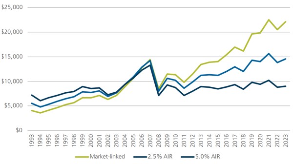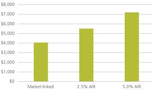 Current rates provide a range of starting payments, per $100,000 of around $4,000 to $7,000 a year, for a 65 year old male. A market-linked lifetime annuity with a 5% AIR has payments starting at a rate 78% higher than one with no AIR. Over time the payments will increase by 5% less each year so over time the payments will cross over. This wedge is independent of market movements.