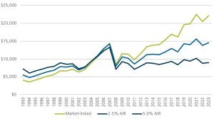 The paths for the 30 years from Dec 1993 to Dec 2023 can be seen in Figure 5. This shows the five-fold increase for payments that were linked to the accumulation performance of the S&P/ASX200 over that time. The 5% AIR hurdle provided the highest initial payment, but lower indexation meant that this would not have been the highest after 2004, only 11 years into retirement. The smaller increase in the payments with a 5% AIR would not have kept up with inflation from the initial payment level. It provided a flatter spending profile that declines in real terms.