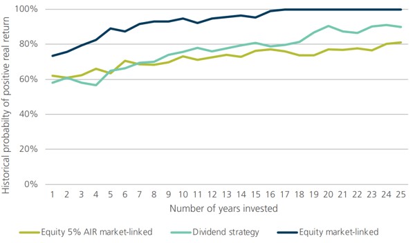 The dividend strategy maintains the capital invested in the underlying equities so the income payments will be lower than what can be achieved if the capital is consumed over retirement. On average, the dividend yield has been 4.65% p.a. and is currently 5.2% including franking credits. Investors might expect inflation protection similar to an equity linked 5% AIR investment. In practice, the initial income is lower with a dividend strategy, but the lower income is better protected than the 5% AIR strategy. However, it can take a long time to catch up the initial income gap.